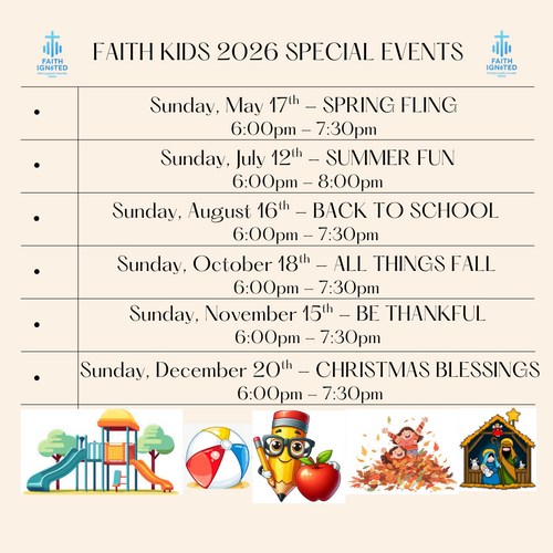 Faith Kids Ministry at Faith Ignited is excited to offer special Sunday evening gatherings throughout 2026 for children in Pre-K through 4th grade. These fun, faith-filled events are designed to help kids grow in their relationship with Jesus while enjoying hands-on activities, games, crafts, and time with friends.